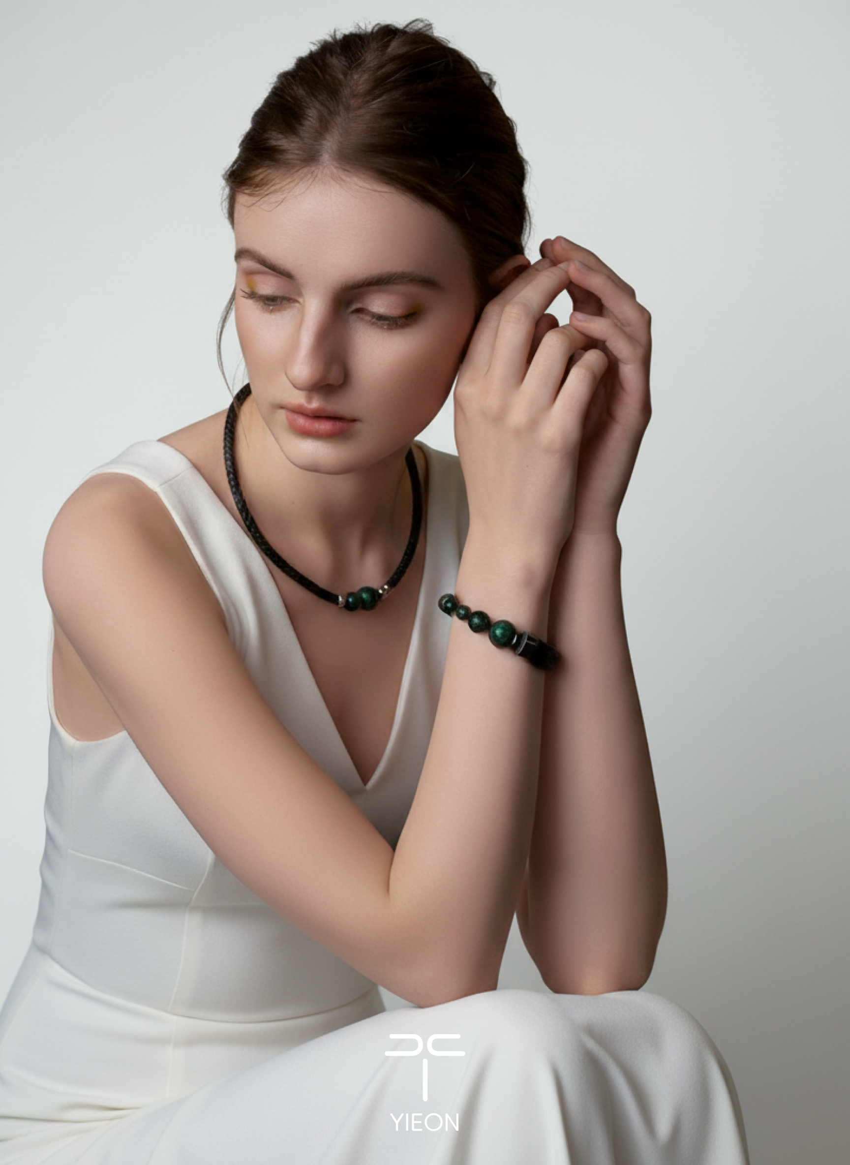 Swirling green lacquer beads reflect the brilliance of the aurora—symbols of hope, intuition, and the journey toward your true north. A necklace for seekers, dreamers, and bold souls.