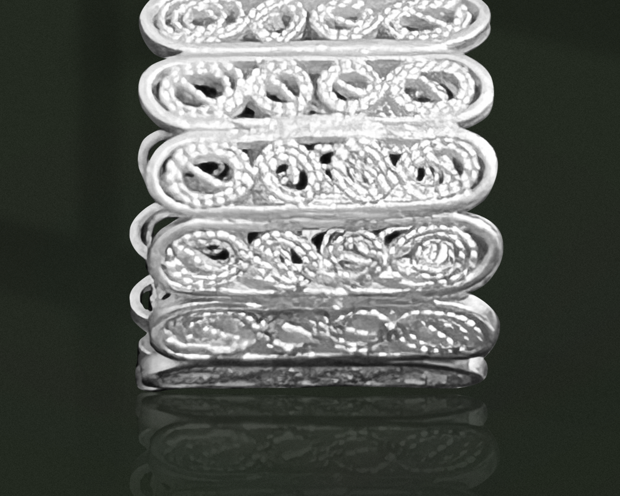 Delicate yet enduring, filigree embodies timeless craftsmanship and the art of meaningful expression. We use only solid, unplated silver—no chemical plating, no shortcuts. Our pieces are handmade in small batches with minimal waste and deep respect for materials, people, and tradition.
